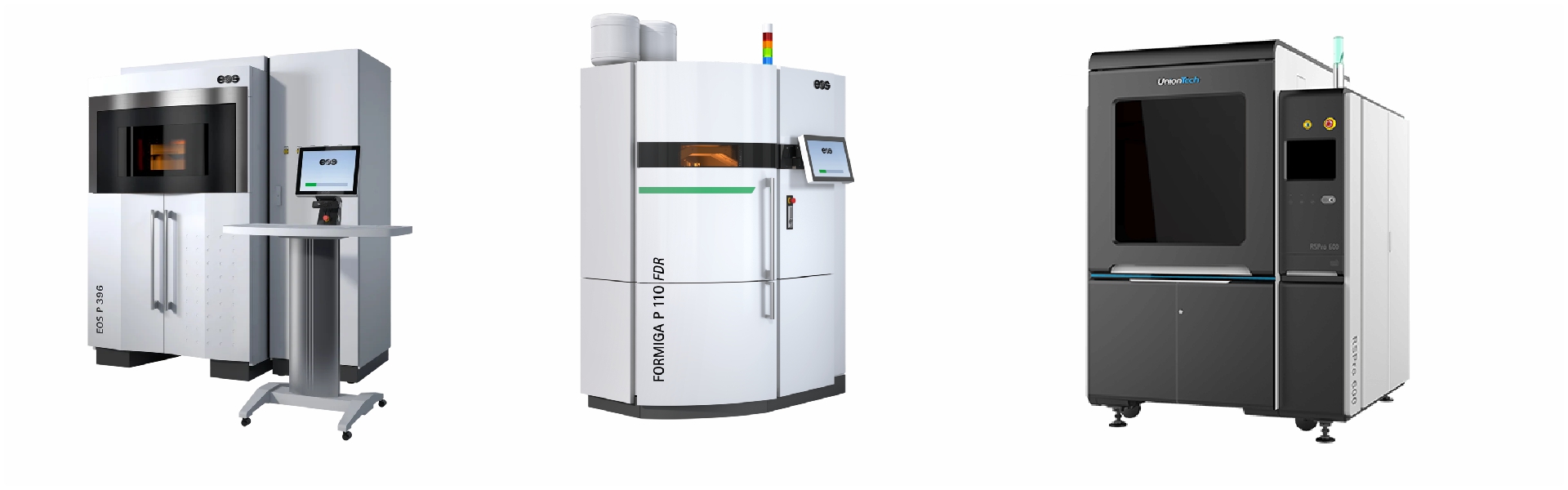 SLS tehnologija za izradu dijelova koristi laser koji topi sloj po sloj plastičnog praha spajajući ga s prethodnih slojem. Materijal koji se koristi je većinom bijele boje (zbog bolje apsorpcije topline), a najčešće korišteni materijali su poliamidi PA6 i PA12, TPU i PEEK. Ti inženjerski materijali omogućuju izradu stvarnih funkcionalnih i trajnih dijelova. SLS tehnologija daje sitno-zrnatu poroznu strukturu s veličinom zrnca od cca 0,1 mm što ograničava detaljnost ispisanih dijelova. Mogu se ispisivati i gumeni odnosno elastični dijelovi, no takvi dijelovi su porozni i slabe otpornosti na deranje.